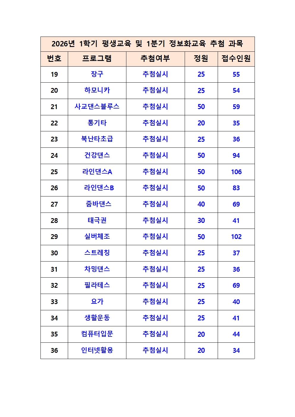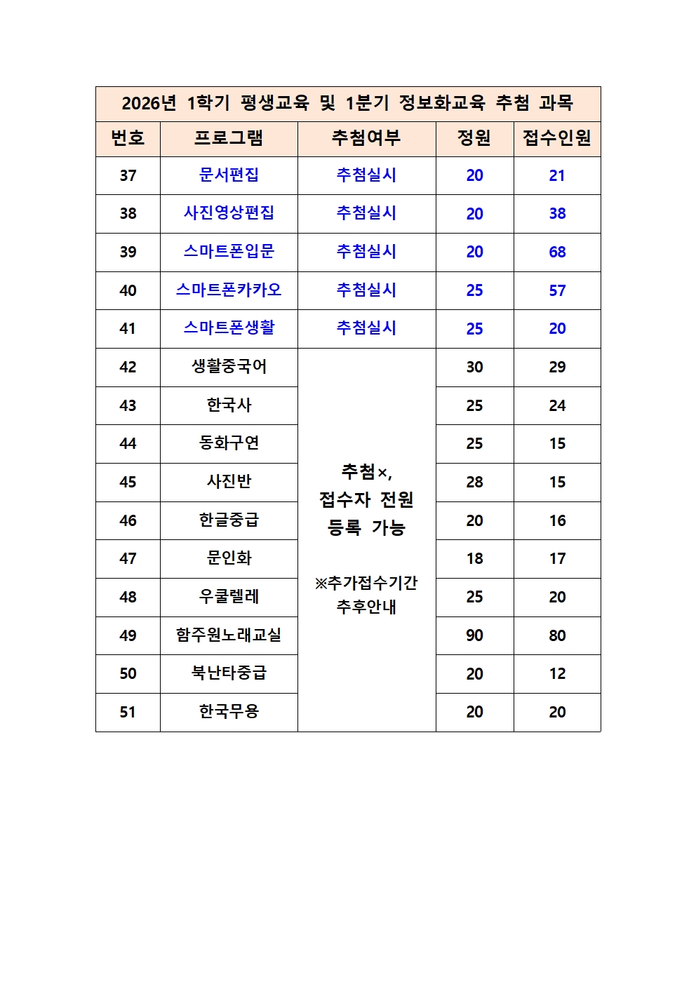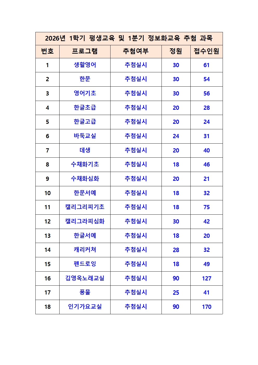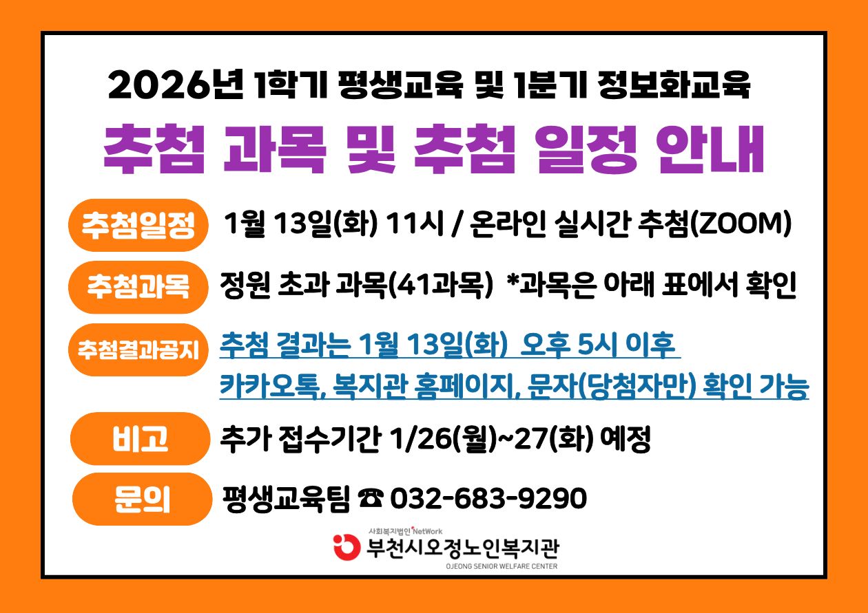 2026년 1학기 평생교육 및 1분기 정보화교육 추첨 과목 및 추첨 일정 공지