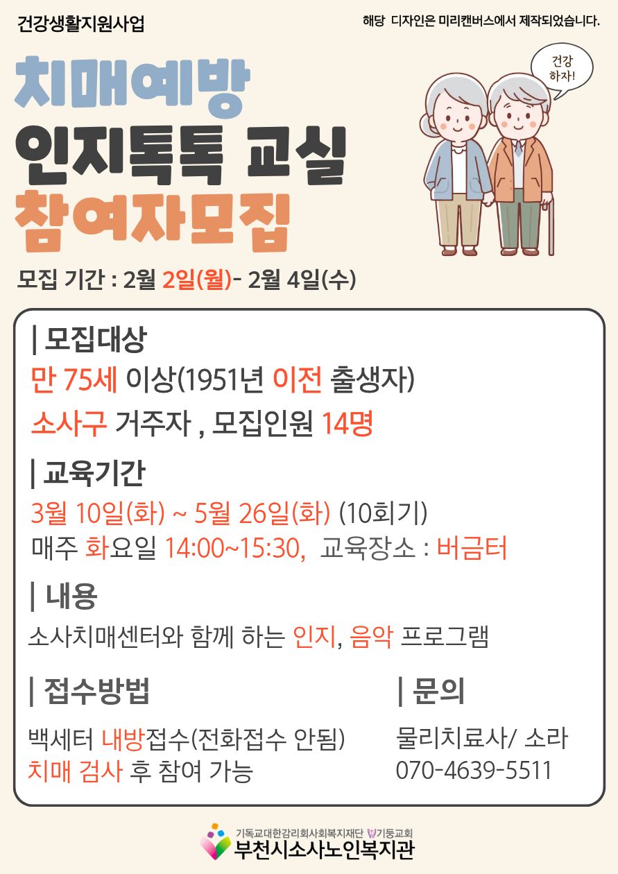 【건강생활지원사업】 2026년 인지톡톡교실 대상자 모집