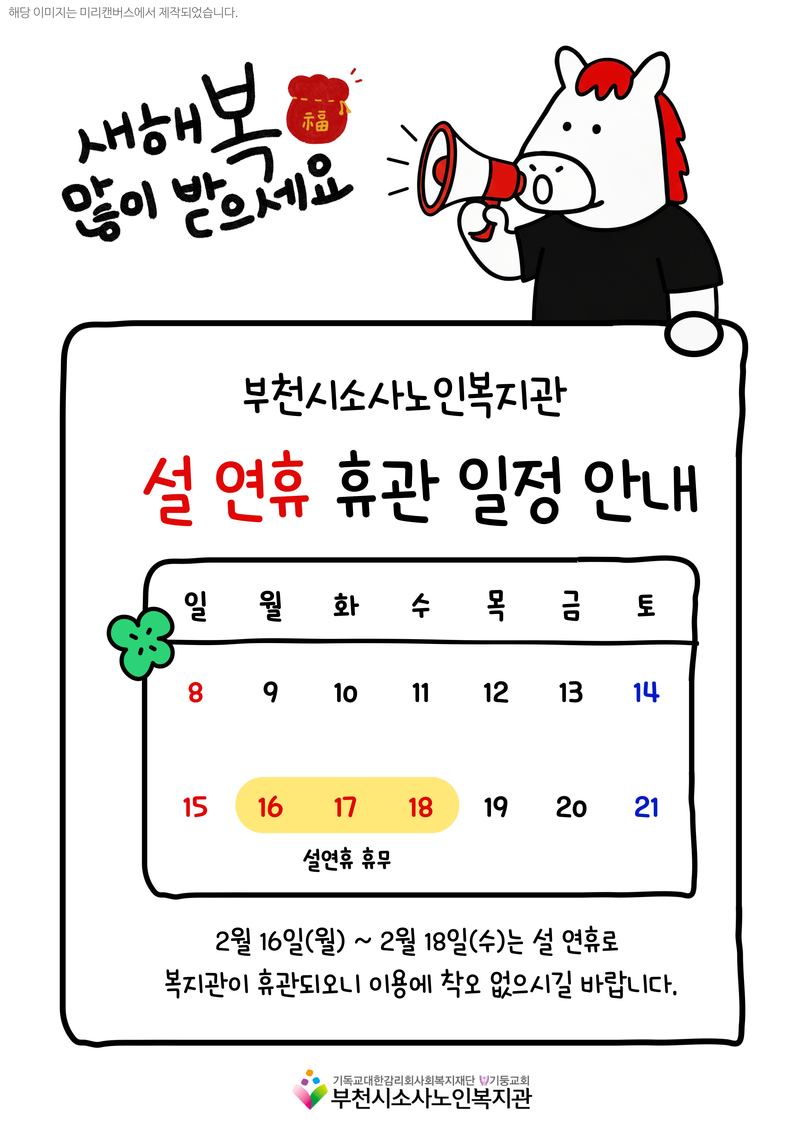 [부천시소사노인복지관] 부천시소사노인복지관 설날 휴관 안내