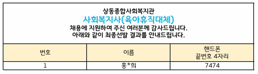 [상동채용결과] 2026년 사회복지사(육아휴직대체) 최종 합격자 발표