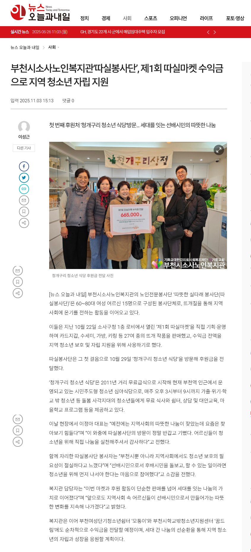 [뉴스오늘과내일]부천시소사노인복지관 '따실봉사단' 제1회 따실마켓 수익금으로 지역 청소년 자립 지원