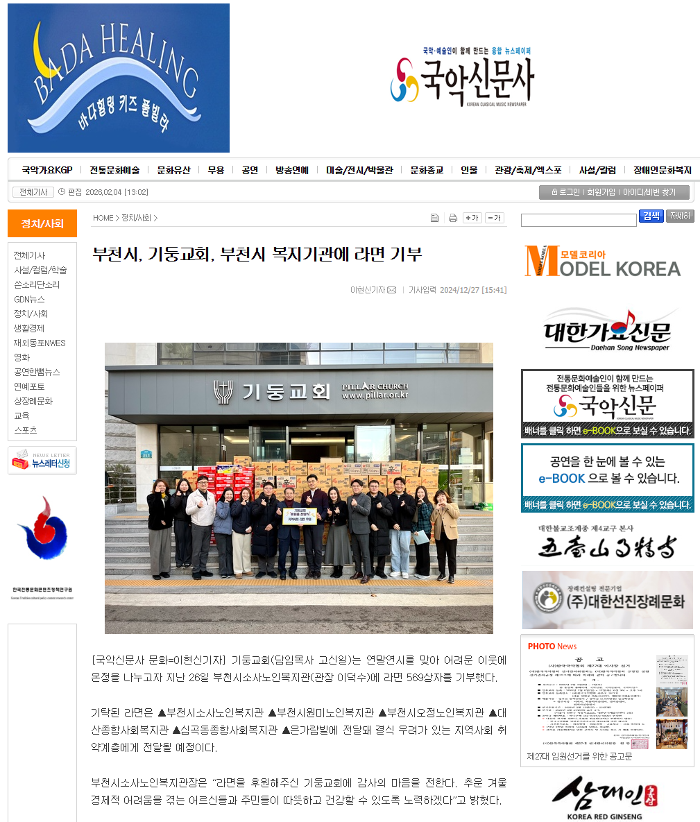 [국악신문사]기둥교회, 복지기관에 결식예방 '라면 800박스' 전달