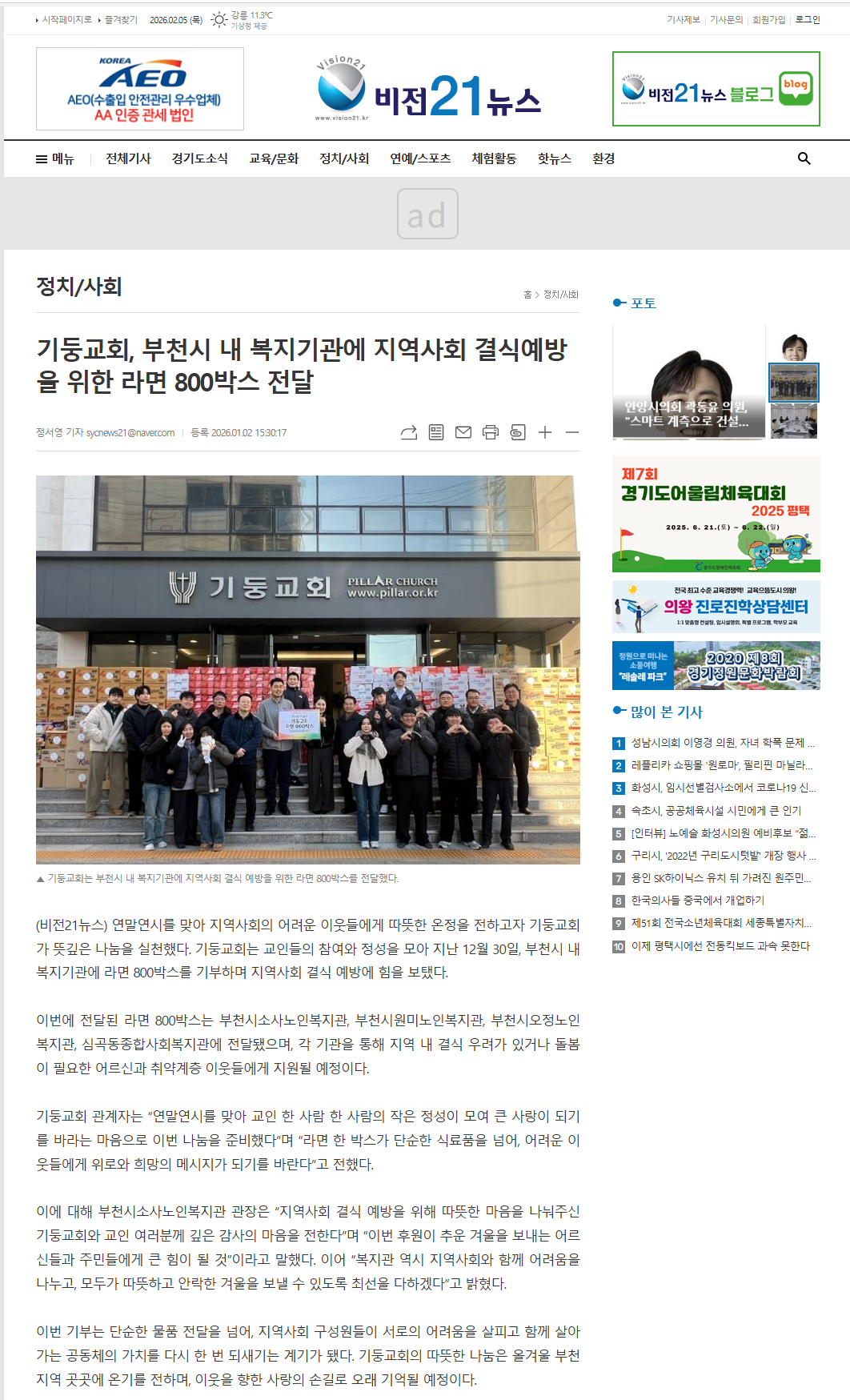 [비전21뉴스]기둥교회, 복지기관에 결식예방 '라면 800박스' 전달