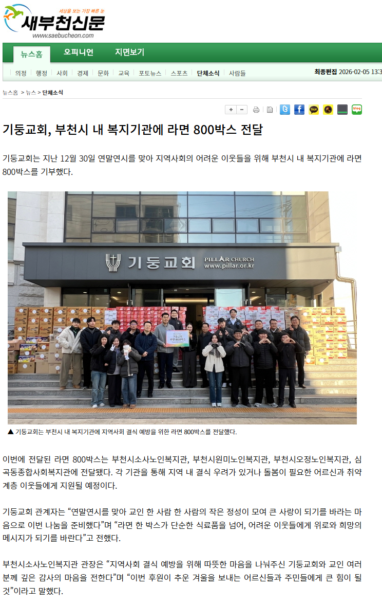 [새부천신문]기둥교회, 복지기관에 결식예방 '라면 800박스' 전달