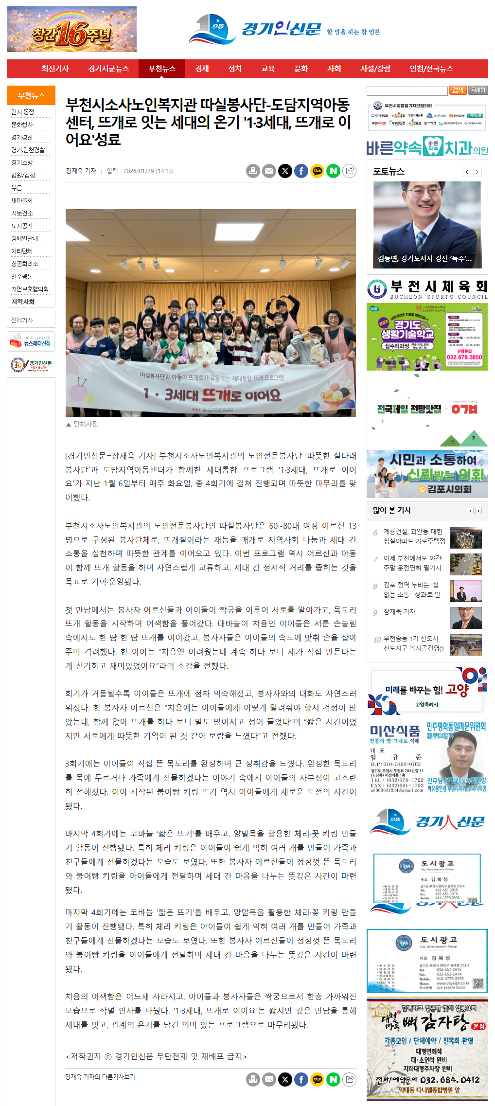 [경기인신문]부천시소사노인복지관 따실봉사단-도담지역아동센터, 뜨개로 잇는 세대의 온기 '1,3세대, 뜨개로 이어요' 성료