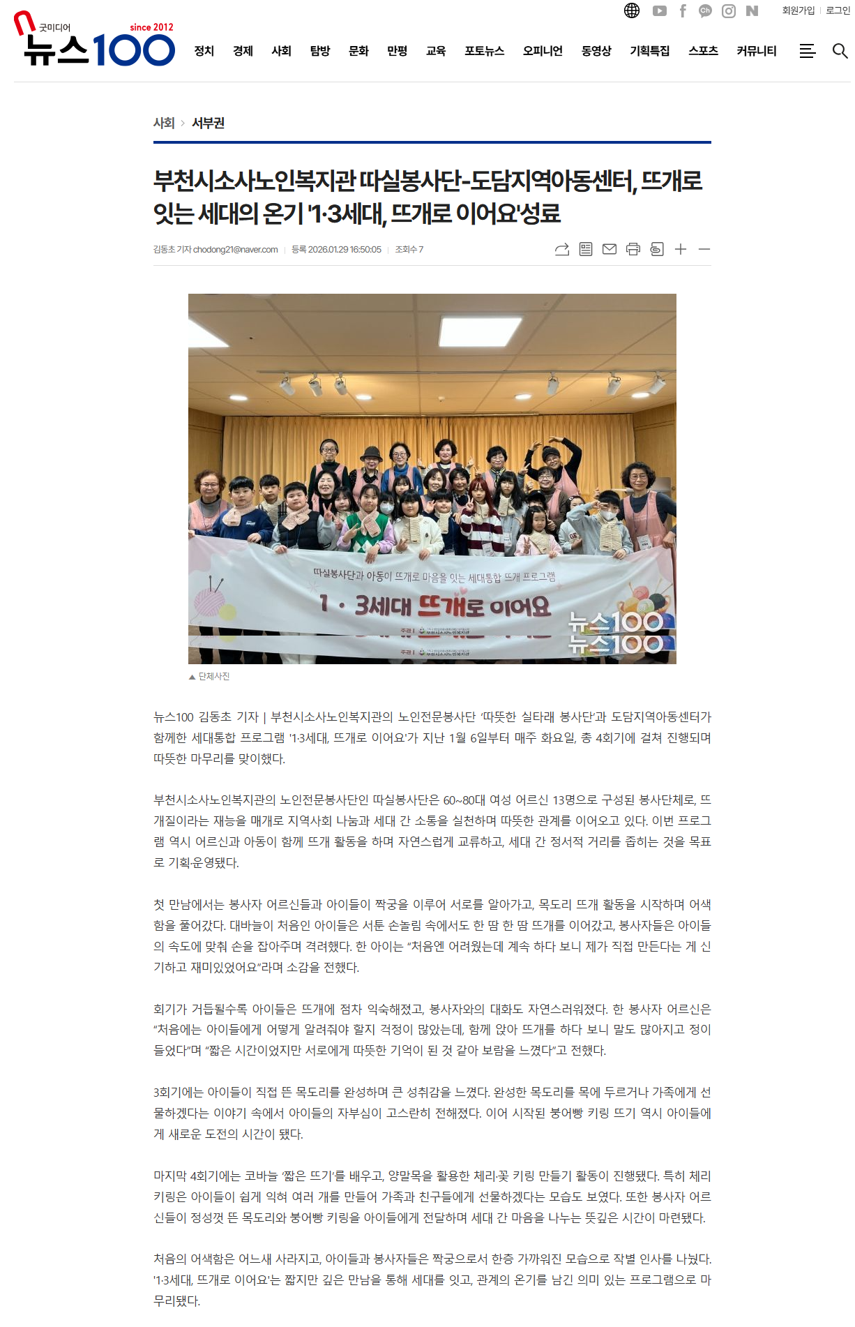 [뉴스100]부천시소사노인복지관 따실봉사단-도담지역아동센터, 뜨개로 잇는 세대의 온기 '1,3세대, 뜨개로 이어요' 성료