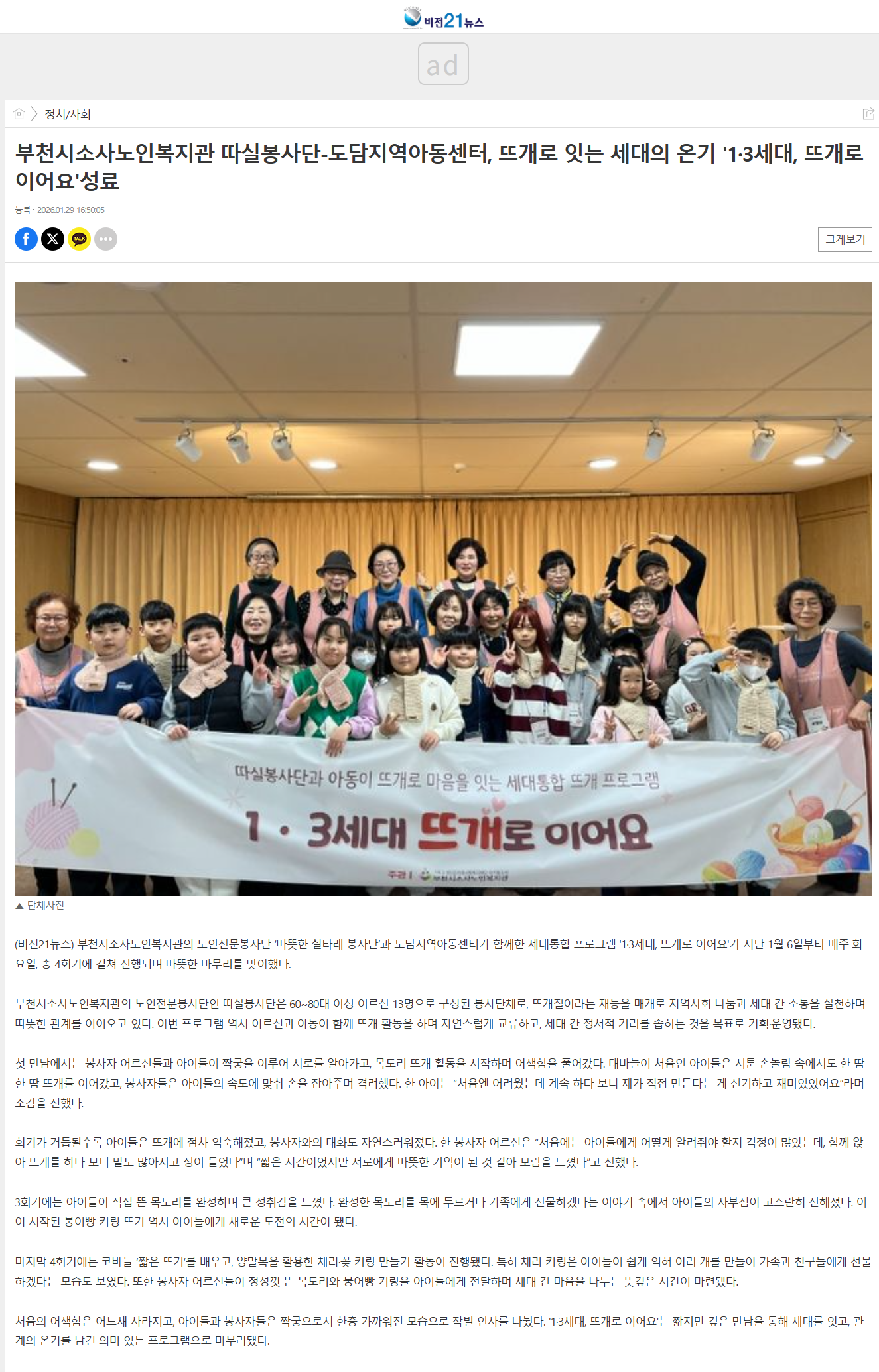 [비전21뉴스]부천시소사노인복지관 따실봉사단-도담지역아동센터, 뜨개로 잇는 세대의 온기 '1,3세대, 뜨개로 이어요' 성료