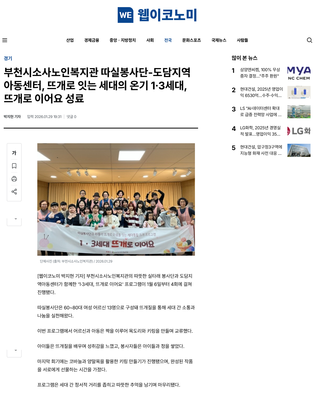 [웹이코노미]부천시소사노인복지관 따실봉사단-도담지역아동센터, 뜨개로 잇는 세대의 온기 '1,3세대, 뜨개로 이어요' 성료