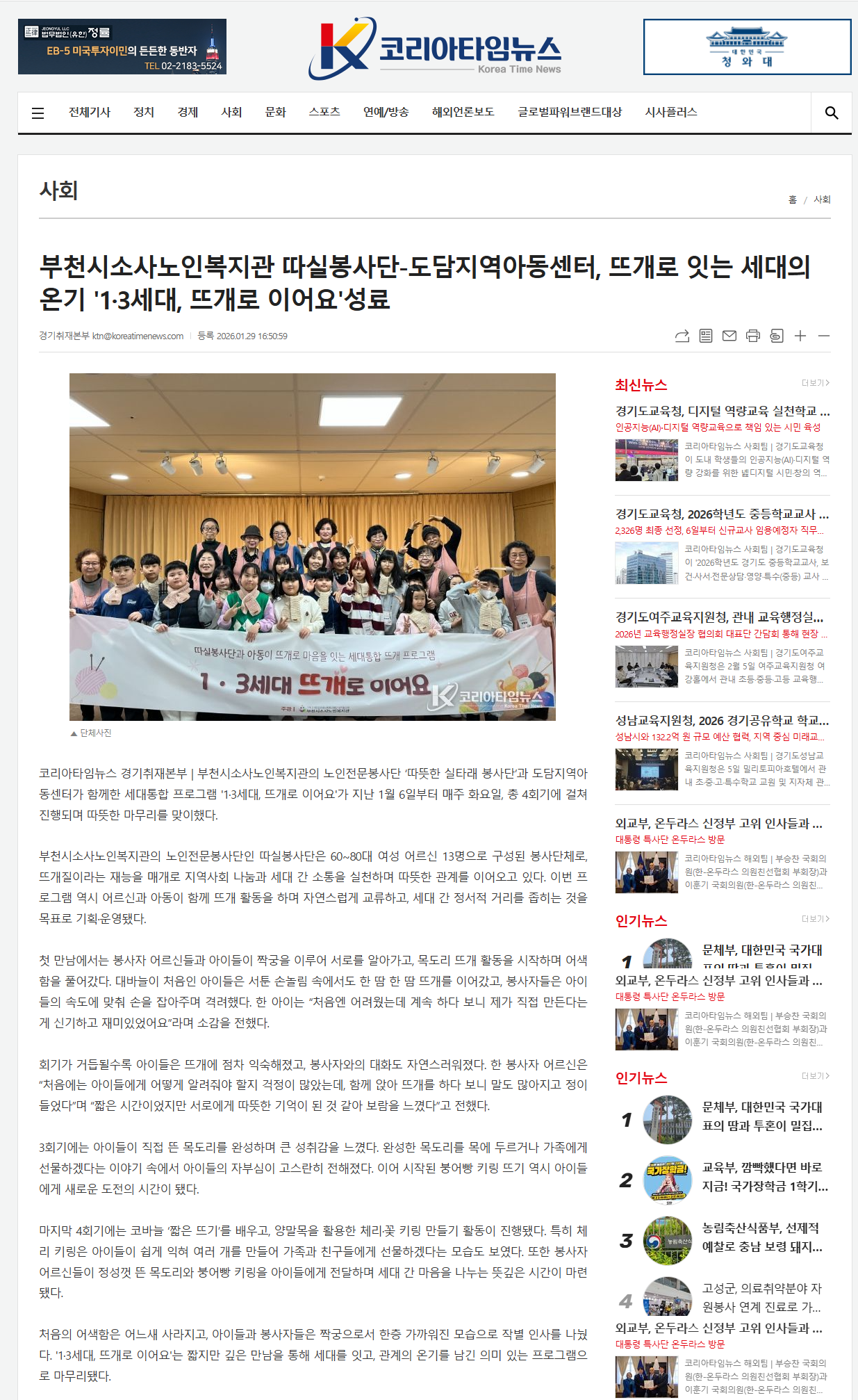 [코리아타임뉴스]부천시소사노인복지관 따실봉사단-도담지역아동센터, 뜨개로 잇는 세대의 온기 '1,3세대, 뜨개로 이어요' 성료