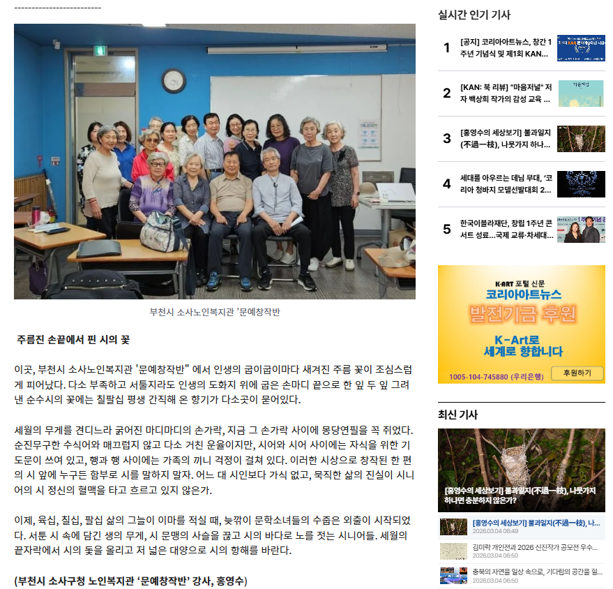 [코리아아트뉴스]오늘부터 나는 시인입니다.-부천시소사노인복지관 '문예창작반' 탐방