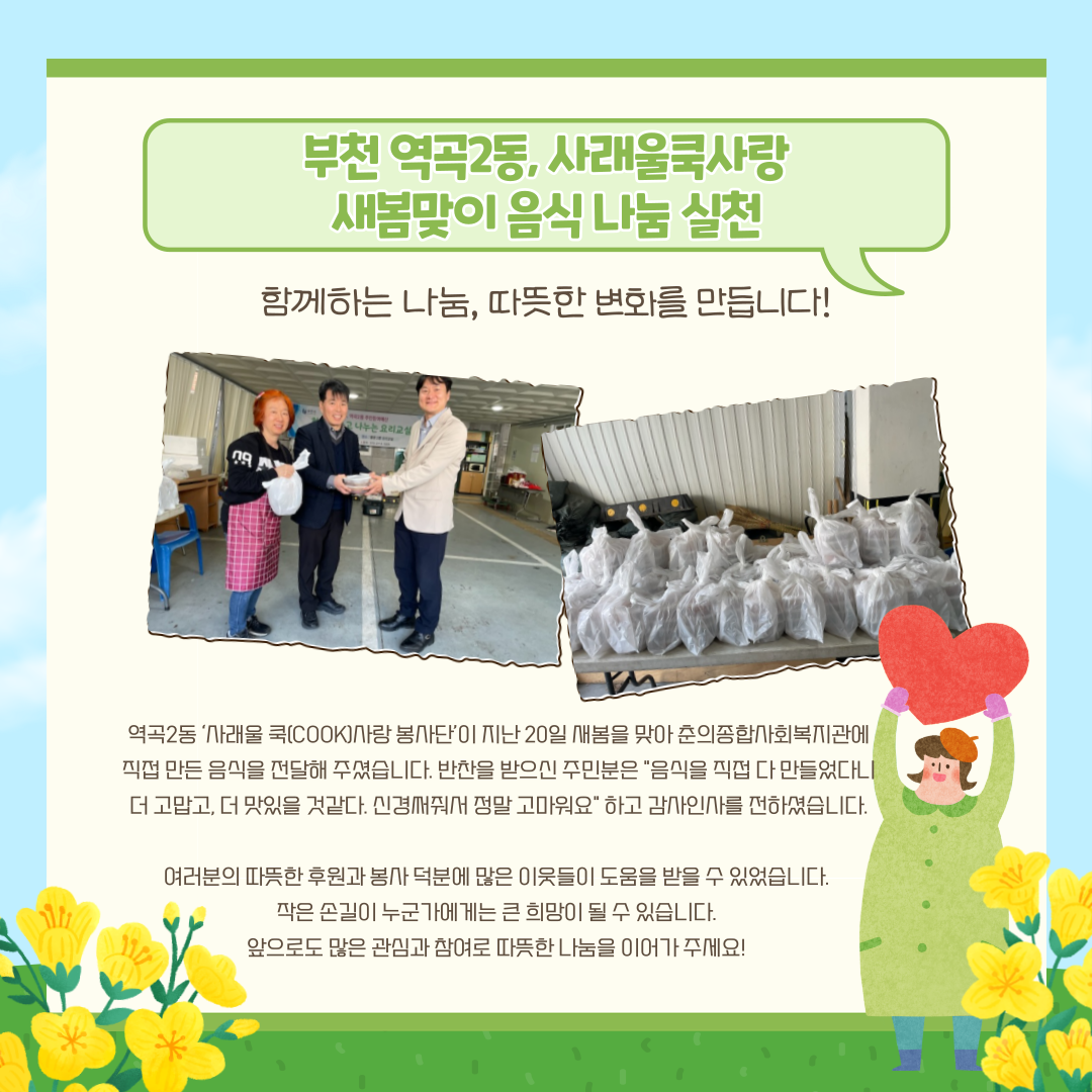 역곡2동 '사래울쿡(cook) 사랑 봉사단'이 새봄을 맞아 춘의종합사회복지관에 직접만든 음식을 전달해주셨습니다.