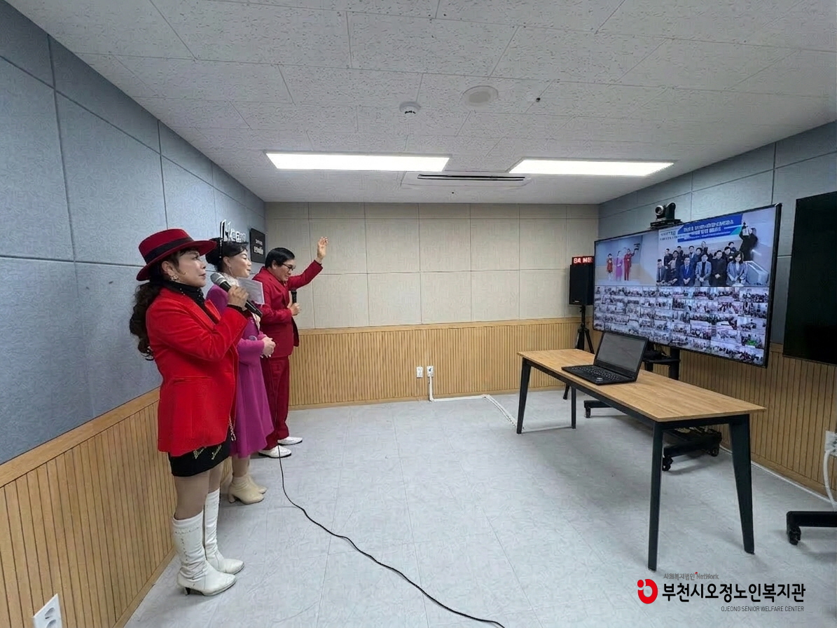 특히 이날 행사에는 스마트경로당을 이용하는 약 2,500명의 어르신이 화상 플랫폼을 통해 실시간으로 참여하며 높은 관심을 보였습니다. 행사에서는 화상장비를 활용한 프로그램 시연이 함께 진행되었으며, 오정노인복지관에서는 노인일자리사업으로 운영되는 ‘부엉이예술단’의 트로트 공연을 우리 복지관 스마트경로당 스튜디오에서 송출하여 어르신들에게 활기찬 문화공연을 선보였습니다.