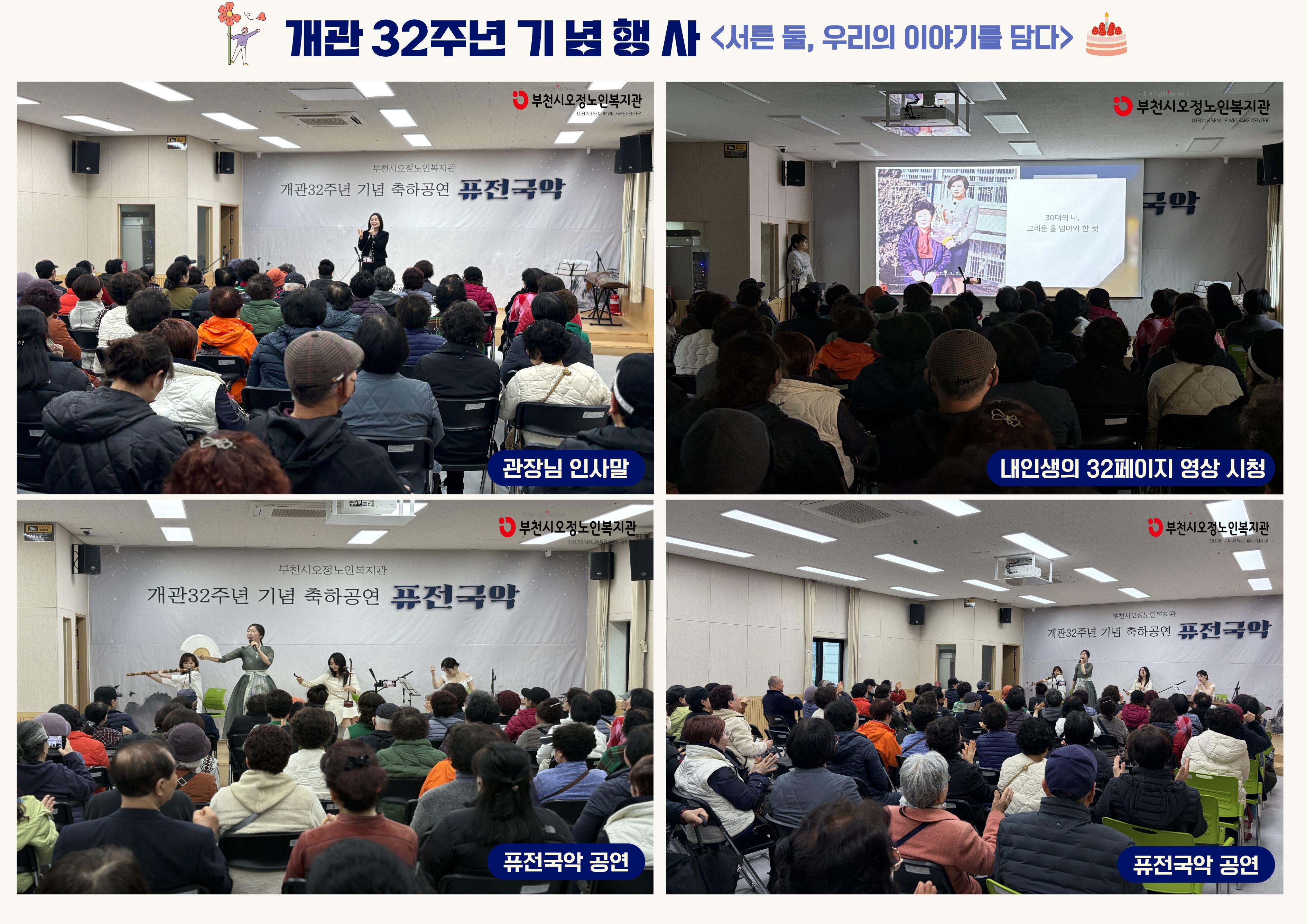 부천시오정노인복지관은 3월 18일(수), 개관 32주년을 맞아 「서른둘, 우리의 이야기를 담다」 행사를 진행하였습니다.